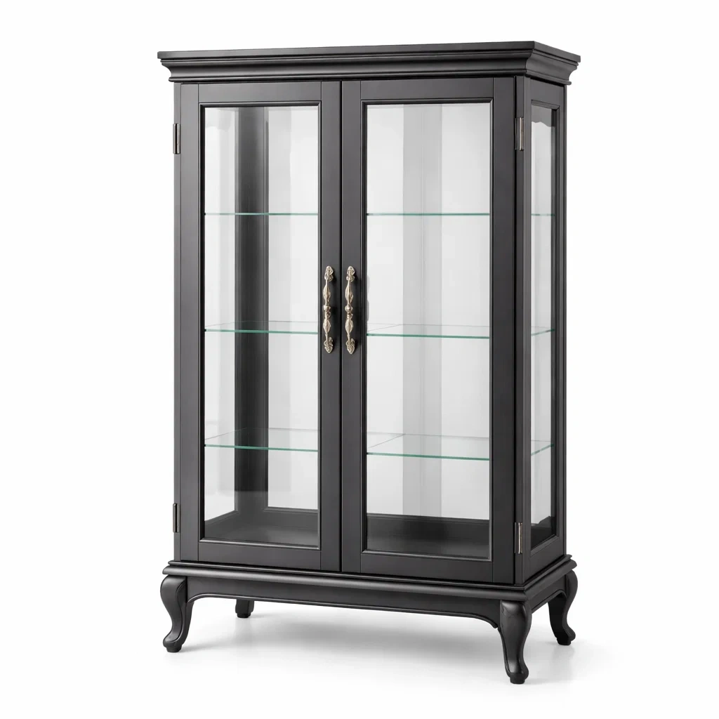 Matériau principal : Bois. Étagères : Verre trempé de 1 cm d'épaisseur. Poignées : Métal avec finition bronze.