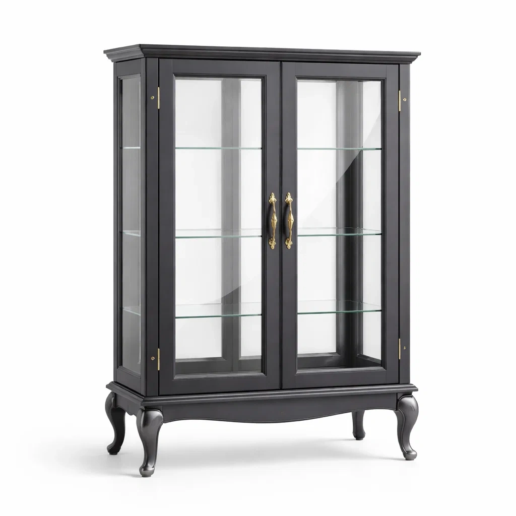 Matériaux : Structure en bois, étagères en verre trempé, poignées en métal doré
