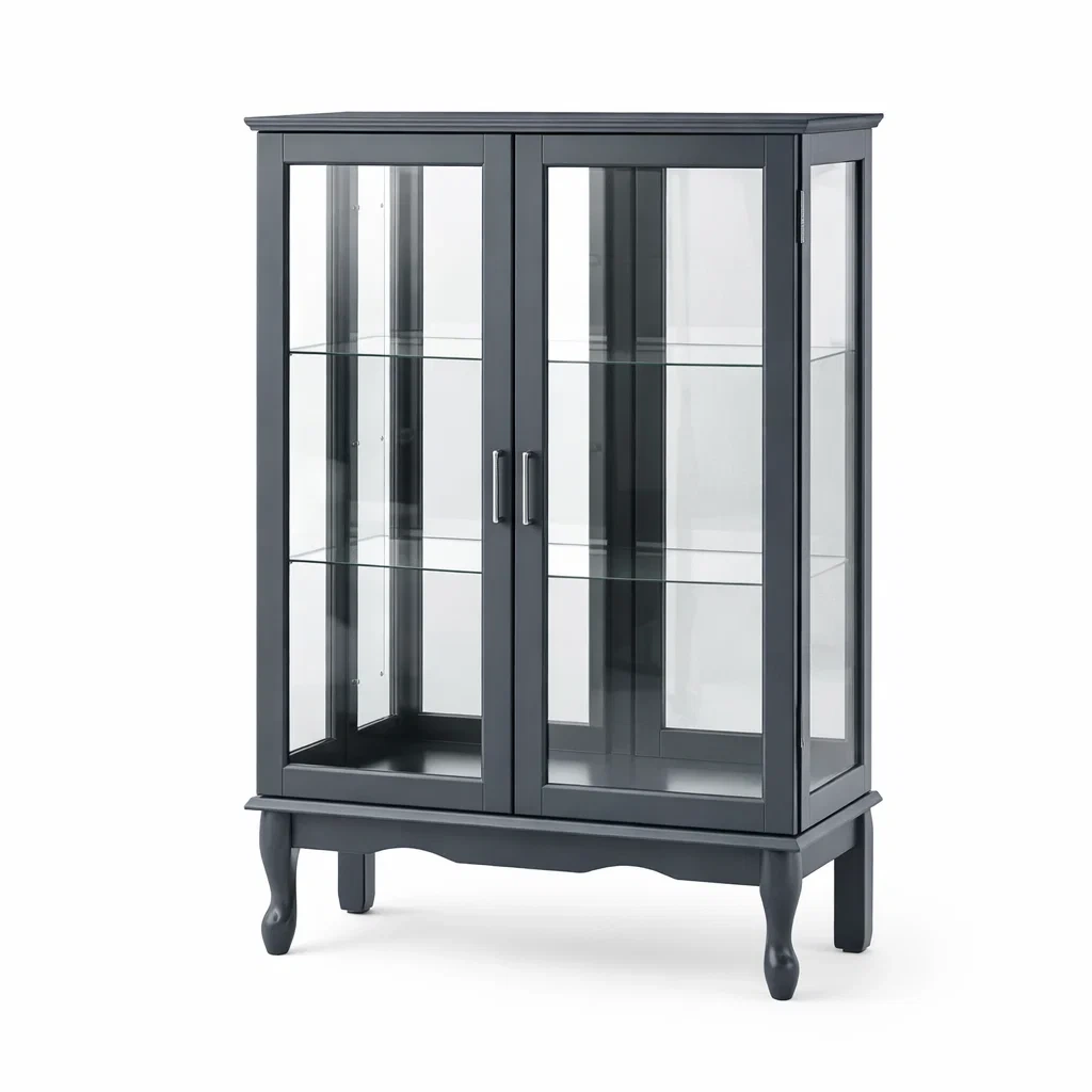 Cette vitrine est fabriquée en bois avec des panneaux latéraux et des portes en verre trempé de 5 mm d'épaisseur. La structure est renforcée par des éléments métalliques. Elle dispose de trois niveaux de rangement, adaptés pour des objets de décoration ou des livres.